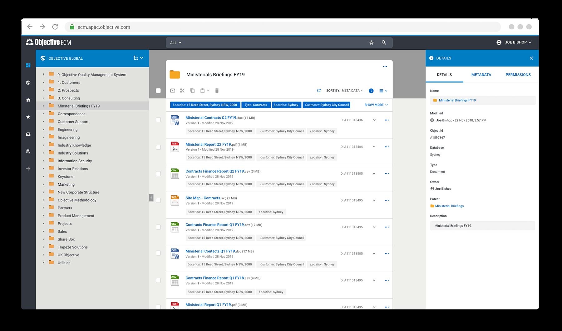 - Complete Visibility: Objective ECM has always captured a rich set of metadata with each and every document. At a glance, Objective IQ provides users everything they need to know about a document. Visual cues to show if a document is being edited with Microsoft 365 or shared via Objective Connect. Location information via bread crumbs or tree menus. Metadata is visible in list view, and further information such as document preview, versions and audit history are all visible on-screen via document details.