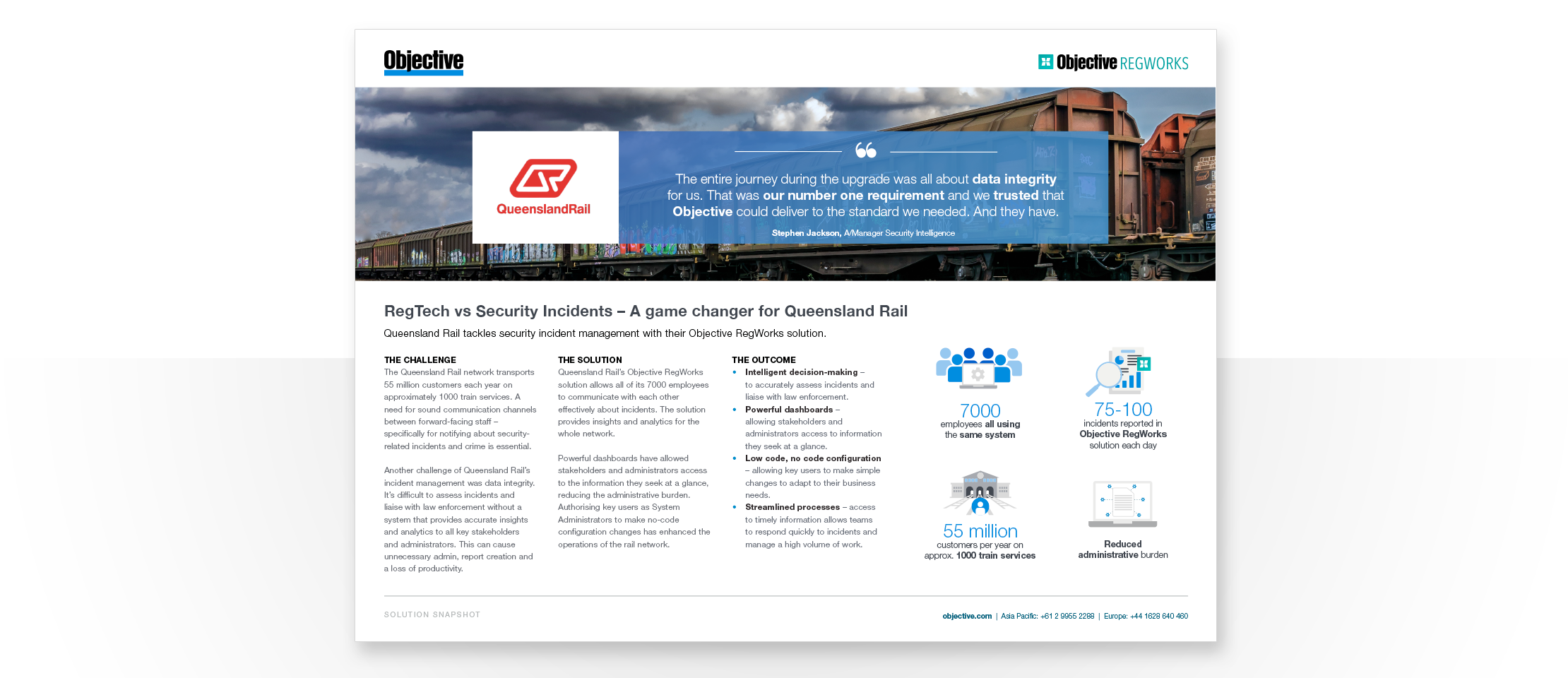 To address this, they implemented Objective's RegWorks solution to allow all of its 7000 employees to communicate with each other effectively about incidents. The solution provides insights and analytics for the whole network and powerful dashboards helping to reduce the administration burden.